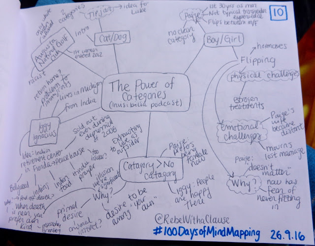 Today marked a first in this project, as I drew out the above mind map while listening to “The Power of Categories” from the Invisibilia podcast.