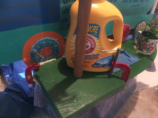Back in the garage I took off the fence, duck, and lights, washed off the base in the backyard, then popped off one side of the roof so I could later add hinges. I had another Michaels run in here, where I got purple, orange, and green acrylic; and gorilla glue. Then once I got the hinges screwed in, I started to paint.