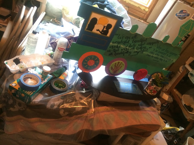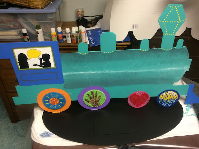 I wanted one side (above) to be the messy/human side, vibrant and in motion. I’d use four different symbols of life/humanity for the wheels, and feature two people talking to one another on the train body. I wanted to incorporate a notebook somehow, which people could take off the train and write in. I planned to use string art on this side, like I’d done for the WI plaque I had made years earlier.
