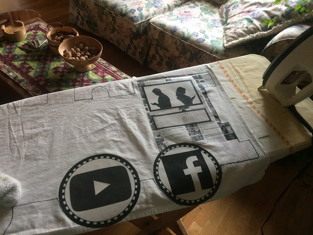 On the opposite side (below), I wanted to represent how technology can sometimes be divisive and prevent us from marveling at the natural world and celebrating our flaws. I wanted it to be sleek and black/white on fabric (to represent a curtain), featuring social media icons on the wheels and two people looking at their phones on the train body.