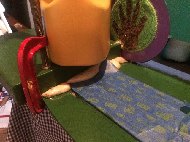 I used the gorilla glue to attach the yarn wheels to the train, doing one at a time and stacking books on top (with a plastic bag in between) for a tight seal.