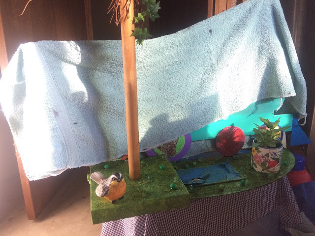 Then it was right on to the base. This involved painting the base green and attaching the mug, birdhouse, and later the bird with gorilla glue. I’d bought a plant from the outdoor greenhouse in town (by Waunabowl), on my most recent run to Ace Hardware. I’d asked the man for something that could fit in a coffee mug that would grow without much care. This particular flower loves the sun and should keep blooming all summer, he told me.
